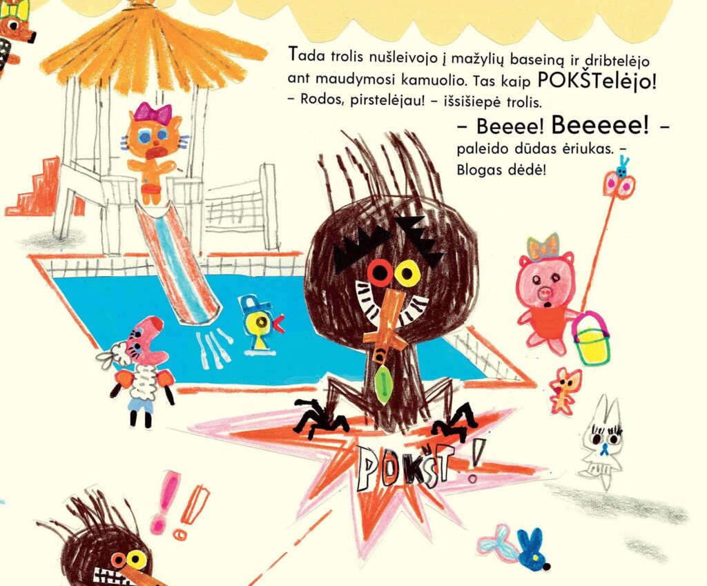 Man atrodo, kad vaikams mano iliustracijos daug mažiau panašios į vaikų piešinius nei suaugusiesiems. Iliustracijose naudojama vaikų piešimo technika ir elemetai, bet kompozicija ir perspektyva — visai ne vaikiškos. Manau, vaikai tai atpažįsta. Tik suaugusieji įžiūri vaikiškumą.