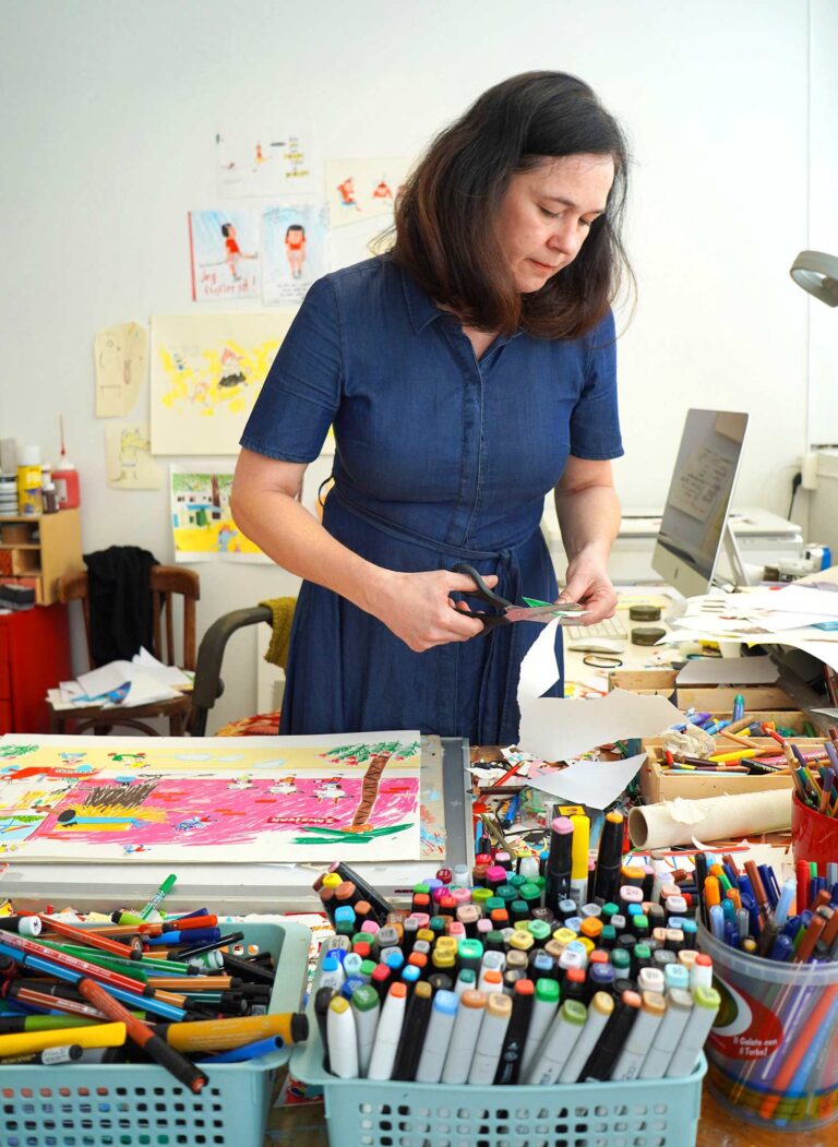Kai piešiau pirmąją knygą apie ožiukus, su rašytoju nieko nesitarėm. Bjørnas gyveno Osle, o aš – Berlyne. Parodžiau jam tik knygos planą ir ėmiausi darbo. Viską piešiau, klijavau ant popieriaus, nenaudojau jokių skaitmeninių priemonių, nes norėjau eksperimentuoti ir kurti vaikų piešinių stiliumi. Tad ir nebuvo kaip ką nors parodyti. Bjørnas iliustracijas pamatė tik tada, kai viskas buvo baigta.