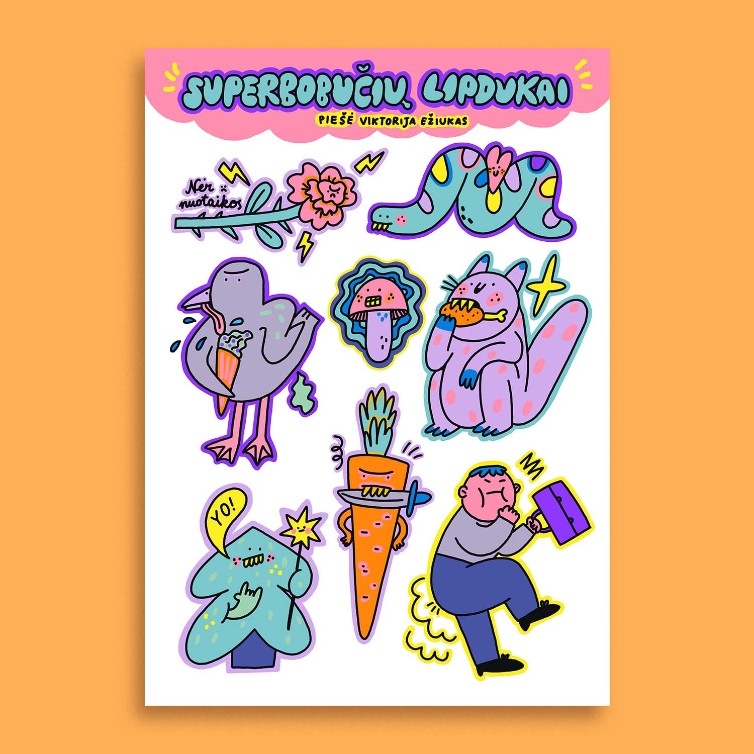 Iliustruotojos Viktorijos Ežiuko sukurti lipdukai pagal knygą SUPERBOBUTĖS 4. Bezdalų laboratorija.