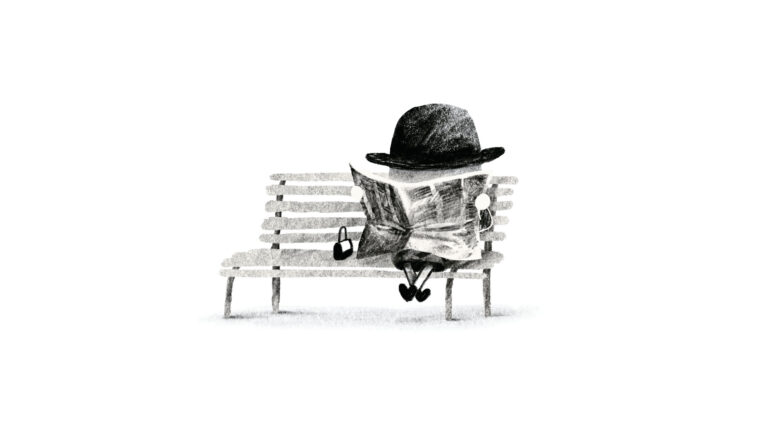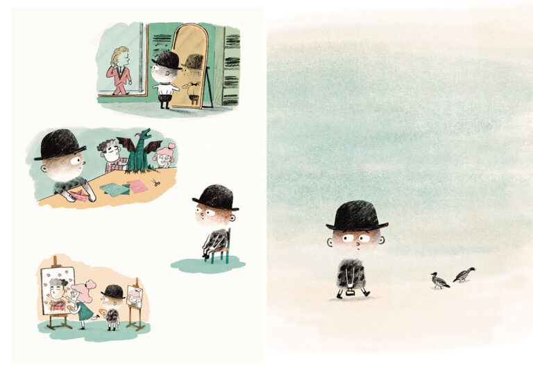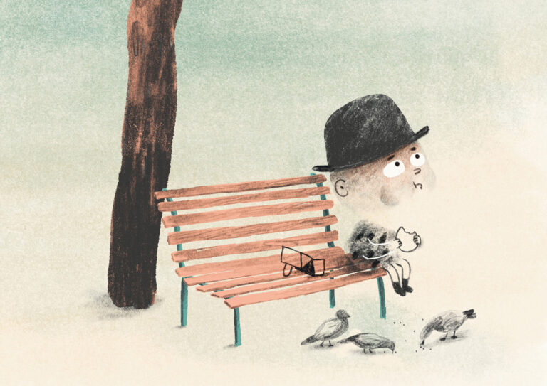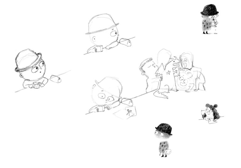 Iliustracija, nuo kurios viskas prasidėjo, gimė tiesiog eskizuojant. Pradžioje nupiešiau debesėlį su dėmelėmis. Tada pridėjau kojas, rankas ir jis tapo paltu. Man patiko, kad jis buvo lyg dūmas, be kontūro. Pripiešiau jam gražią ištirpstančią galvą ir skrybėlę, tinkančią prie palto. Galiausiai pasodinau šį personažą ant suoliuko ir įdaviau skaityti laikraštį. Šiuo piešiniu pasidalinau Instagrame. Kai Marica atsiuntė mano personažui sugalvotą istoriją, buvo labai įdomu, kad joje atsispindėjo man itin artimos temos – drovumas, vienatvė, nepastebimumas. Labai apsidžiaugiau, kad galėsiu apie tai sukurti knygą!